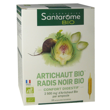 Le laboratoire Santarome français conçoit des compléments alimentaires à base de plantes bio. Artichaut Bio Radis noir BIO est un complément alimentaire en ampoules. Sa formule associe de l'artichaut et du radis noir. L'artichaut présent dans ce complément alimentaire participe à maintenir un foie sain.