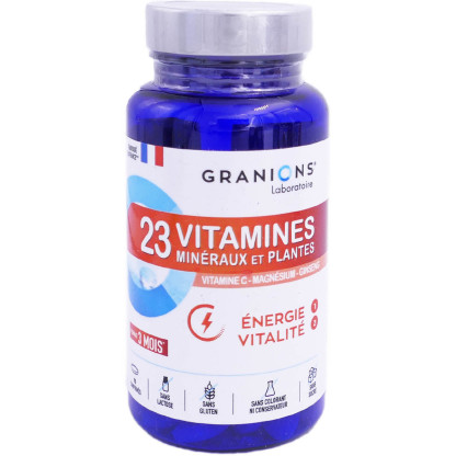Les laboratoires des GRANIONS du groupe français EA Pharma développent des compléments alimentaires élaborés avec des actifs d'origine naturelle de qualité : plantes, oligoéléments, acides gras, vitamines et minéraux. Les différentes gammes GRANIONS proposent des compléments alimentaires à base d’actifs qui vont aider au fonctionnement de l’organisme. GRANIONS 23 vitamines Minéraux et Plantes est un complément alimentaire sous forme de comprimés, qui apporte 23 vitamines, des minéraux et des plantes dont de la vitamine C et du Magnésium qui contribuent à réduire la fatigue. La formule est complété par du ginseng qui favorise des sentiments d'énergie et de vitalité.