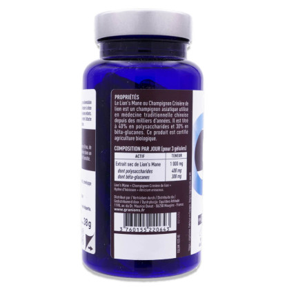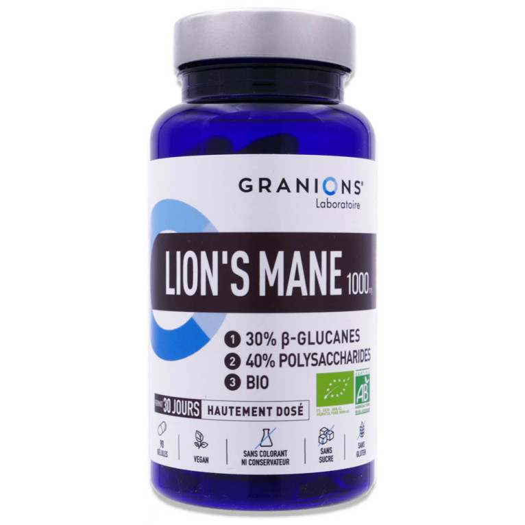 Le complément alimentaire Lion's Mane du laboratoire Granions est formulé à partir d'extrait sec de Champignon Crinière de lion (Hydne hérisson – Hericium erinaceus). Le Champignon Crinière de Lion, également connu sous le nom de Lion's Mane, est un champignon asiatique employé dans la médecine traditionnelle chinoise depuis des millénaires. Il contient 40% de polysaccharides et 30% de bêta-glucanes. Ce produit bénéficie de la certification agriculture biologique.