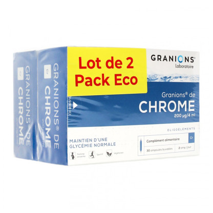 GRANIONS CHROME PACK ECO 2 X 30 AMPOULES est un complément alimentaire en vente en ligne, sur le site de votre parapharmacie à prix discount, est un complément alimentaire idéal pour réguler le métabolisme des sucres et des graisses.