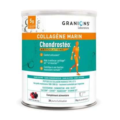 GRANIONS COLLAGENE MARIN CHONDROSTEO ARTICULATIONS 280G en vente en ligne sur le site de votre parapharmacie à prix discount est un complément alimentaire qui aide à maintenir le confort des articulations