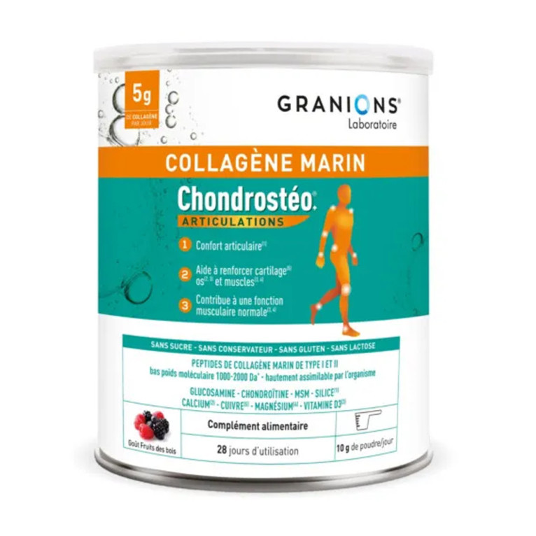 Le GRANIONS COLLAGENE MARIN CHONDROSTEO ARTICULATIONS 280G est un mélange de collagène marin et de chondroïtine, deux composants essentiels pour le bon fonctionnement des articulations, tendons et ligaments. Ce complément alimentaire contient également du bambou (titré en silice) pour favoriser le confort articulaire et renforcer les os, de la vitamine D3 qui contribue au maintien d'une ossature normale et d'une fonction musculaire normale, du calcium qui contribue au maintien du capital osseux, du cuivre qui assure le maintien des tissus conjonctifs tels que le cartilage, et du magnésium pour une fonction musculaire normale. En prenant régulièrement ce complément alimentaire, vous pouvez aider à maintenir la souplesse et la mobilité de vos articulations. Le GRANIONS COLLAGENE MARIN CHONDROSTEO ARTICULATIONS 280G est facile à utiliser, il suffit de mélanger une dose dans un verre d'eau et de le boire une fois par jour.