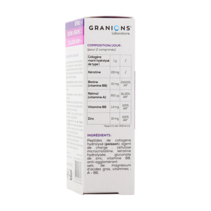 Les cheveux et les ongles sont également exposés au vieillissement avec l'âge. De cette façon, leur croissance et leur qualité de pousse diminuent, ce qui les rend plus vulnérables et cassants. De son côté, la peau perd son éclat en raison de la diminution de la production de collagène. Une formule exceptionnelle a été créée par le Laboratoire Granions en utilisant des actifs pour la peau, les cheveux et les ongles. Ce complément alimentaire est formulé à partir de biotine, de vitamine B6 et de zinc. La biotine contribue au maintien de cheveux normaux et d'une peau normale. Le zinc participe au maintien de cheveux normaux, d’ongles normaux et d’une peau normale. Il contient également du rétinol, de la kératine et du collagène marin. Ce produit es formulé sans gluten, sans lactose, sans conservateur et sans sucre. Retrouvez ce complexe sur le site de votre parapharmacie à prix discount.