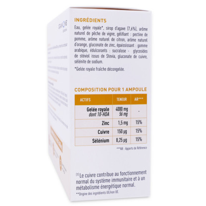 Chaque ampoule contient 4000 mg de gelée royale, garantissant une concentration élevée en 10-HDA (Acide 10-Hydroxy-2-Décénoïque). La gelée royale est produite par les abeilles riche en vitamines, minéraux, oligo-éléments, acides aminés et acides gras essentiels. La gelée royale est bénéfique pour les abeilles grâce à ses propriétés nutritives et antibactériennes. Du sélénium, du zinc et du cuivre complètent la formule : le cuivre contribue au fonctionnement normal du système immunitaire et à un métabolisme énergétique normal Son goût agréable de pêche-agrumes rend sa consommation plaisante et facile.