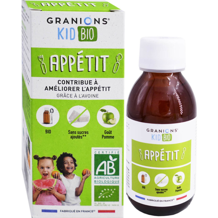 Les laboratoires des GRANIONS du groupe français EA Pharma développent des compléments alimentaires élaborés avec des actifs d'origine naturelle de qualité : plantes, oligoéléments, acides gras, vitamines et minéraux. Les différentes gammes GRANIONS proposent des compléments alimentaires à base d’actifs qui vont aider au fonctionnement de l’organisme. Chaque sirop des laboratoires GRANIONS sont fabriqués avec une base de sirop d’agave certifié bio. Le sirop Appétit KID BIO est un complément alimentaire sous forme de sirop, composé d’extraits de plantes : avoine, gingembre, gentiane, fenugrec. L’extrait d’avoine contribue à améliorer l’appétit. Au bon goût de pomme, le sirop ravira les plus gourmands !