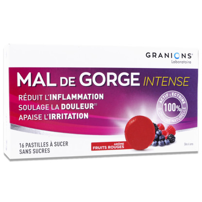 GRANIONS MAL DE GORGE INTENSE 16 PASTILLES GOUT FRUITS ROUGES est disponible en vente en ligne à prix discount sur Pharmashopdiscount.