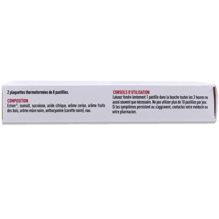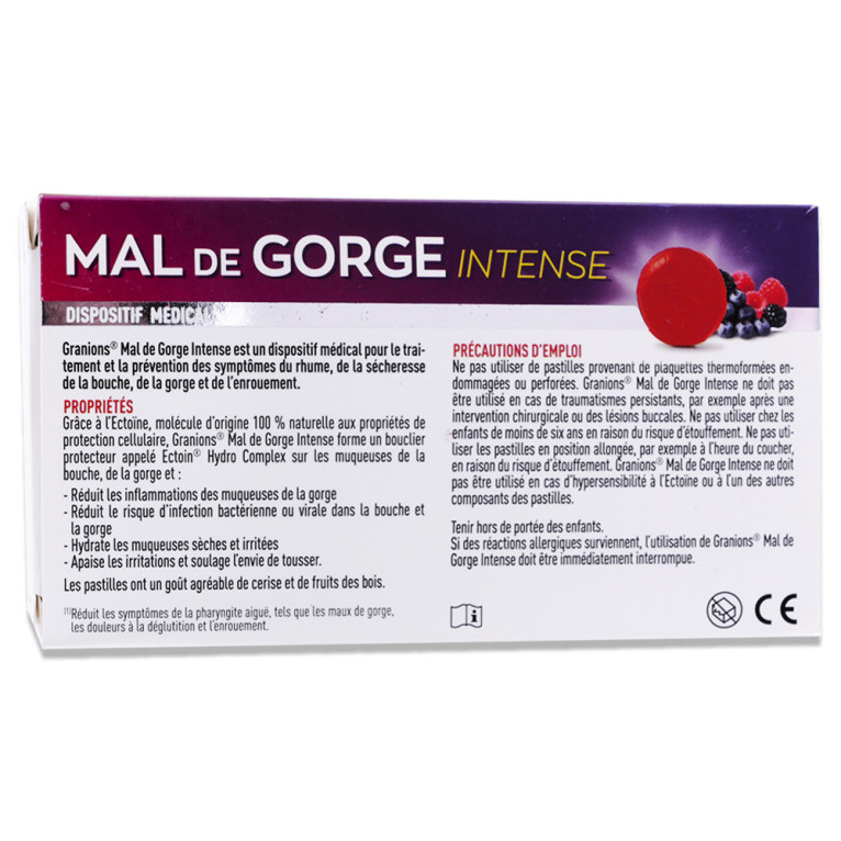 Avertissements : Si les symptômes persistent ou s'aggravent, contactez votre médecin ou votre pharmacien. Ne pas utiliser de pastilles provenant de plaquettes thermoformées endommagées ou perforées. Granions® Mal de Gorge Intense ne doit pas être utilisé en cas de traumatismes persistants, par exemple après une intervention chirurgicale ou des lésions buccales. Ne pas utiliser chez les enfants de moins de six ans en raison du risque d’étouffement. Ne pas utiliser les pastilles en position allongée, par exemple à l’heure du coucher, en raison du risque d’étouffement. Granions® Mal de Gorge Intense ne doit pas être utilisé en cas d’hypersensibilité à l’Ectoïne ou à l’un des autres composants des pastilles. Conserver hors de portée des jeunes enfants.