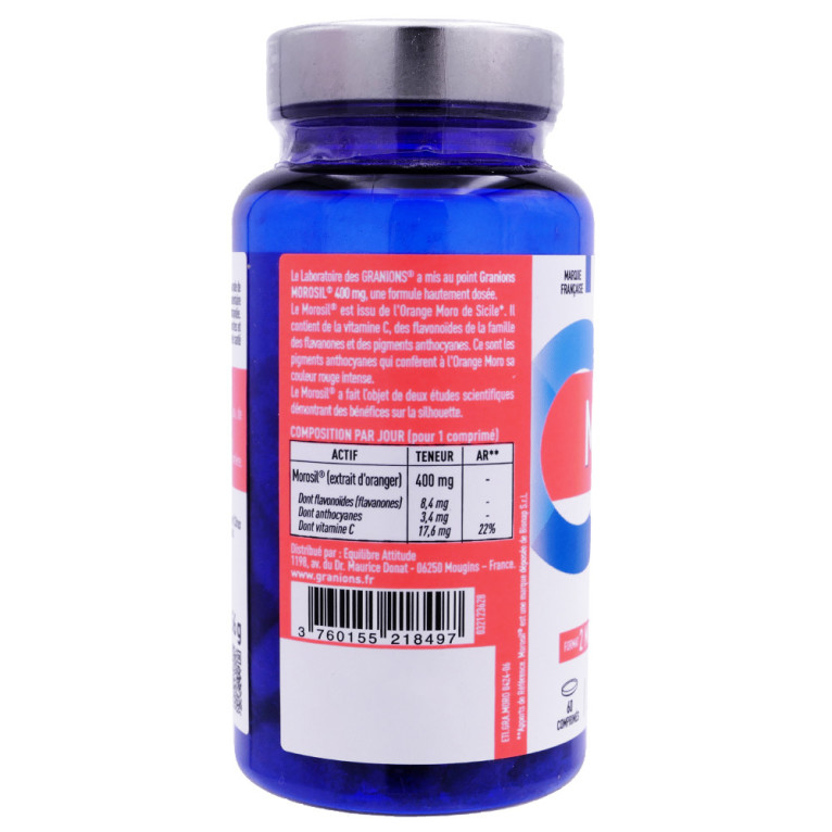 Composition pour 1 comprimé: Morosil® (extrait d'oranger) 400 mg dont flavonoïdes (flavanones) 8,4 mg, dont anthocyanes 3,4 mg, dont vitamine C 17,6 mg (AR vitamine C = 22%**).