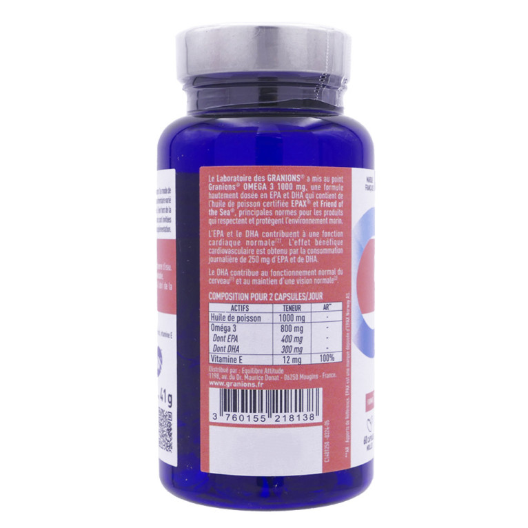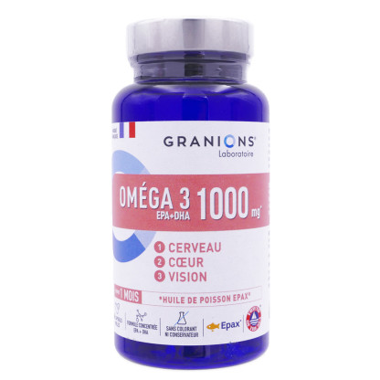 Ce complément alimentaire, issu de la gamme GRANIONS, contient des acides gras oméga-3, notamment l'EPA et le DHA, qui participent à une fonction cardiaque normale. De plus, ces acides gras aident au fonctionnement du cerveau et soutiennent la fonction visuelle. La vitamine E contribue à la protection des cellules de l'organisme contre le stress oxydatif.