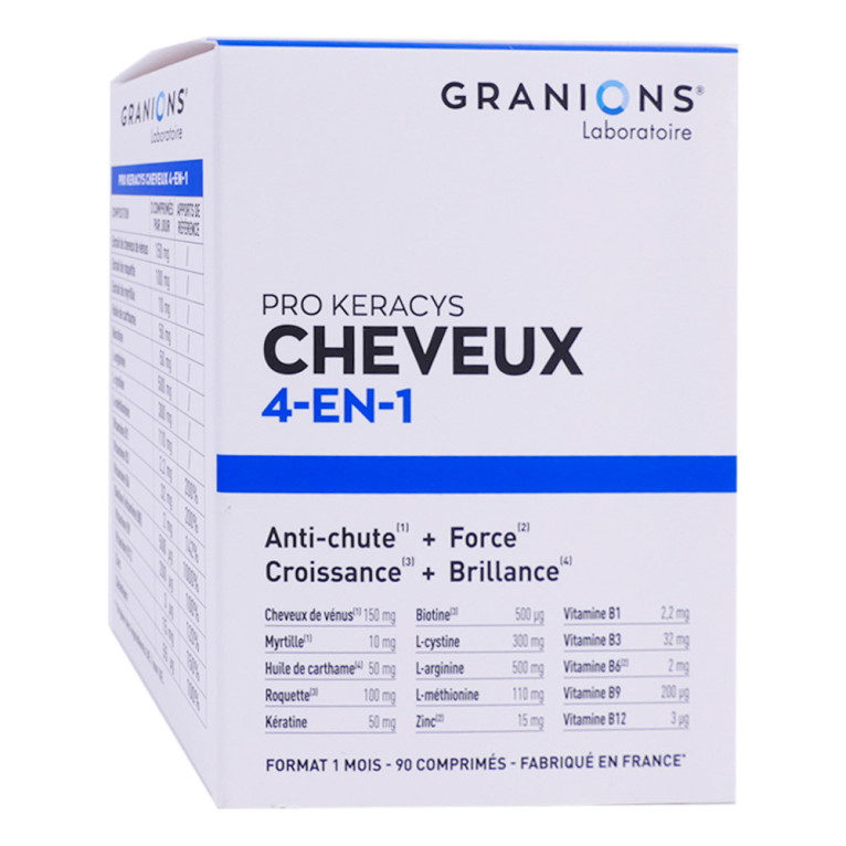 Grâce à leur formule unique, ils agissent sur 4 aspects essentiels pour des cheveux sublimes : la croissance, la densité, la résistance et la brillance.Les comprimés GRANIONS PRO KERACYS CHEVEUX 4 EN 1 contiennent des actifs de haute qualité tels que la kératine, les acides aminés, le complexe PRO KERACYS® qui associe la L-cystine, le zinc et la vitamine B6 associé à des extraits de plantes (cheveux de vénus, roquette, myrtille, huile de carthame). La kératine, principal composant du cheveu, renforce la structure capillaire et favorise la croissance. Le cheveux de vénus, qui était utilisé par les grecs comme lotion capillaire, aide à prévenir la chute de cheveux. La myrtille active la microcirculation du cuir chevelu. La roquette favorise la croissance des cheveux et la biotine maintient des cheveux normaux. Le complexe PRO KERACYS® contient de la L-cystine, du zinc et de la vitamine B6. Le zinc maintient des cheveux normaux et la vitamine B6 favorise la synthèse normale de la cystéine. La cystine est un constituant de la kératine, formée par l'association de deux cystéines. L'huile de carthame, riche en acides gras essentiels, renforce le film hydrolipidique de la tige du cheveu, ce qui donne de l'éclat et de la brillance aux cheveux. En utilisant régulièrement les comprimés GRANIONS PRO KERACYS CHEVEUX 4 EN 1, vous constaterez une amélioration significative de la qualité de vos cheveux. Ils retrouveront force, densité et brillance.