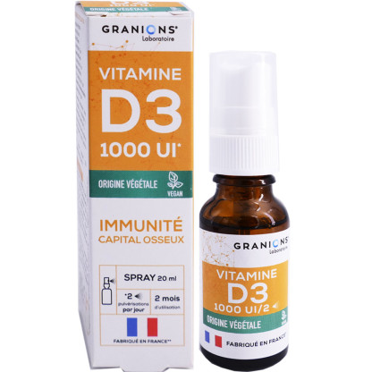 GRANIONS Vitamine D3 1000 UI* est un complément alimentaire sous forme de spray buccal à base de vitamine D3 d’origine végétale issue du Lichen (association d’un champignon et d’une algue qui pousse sur les rochers et les arbres). La vitamine D3 contribue au maintien d’os normaux. L’huile vierge de colza complète la formule afin de faciliter l’absorption de la vicianine D dans l’organisme. Au goût neutre GRANIONS Vitamine D3 1000 UI, sera très pratique à emporter partout. Compatible avec un régime végan. *Unités Internationales