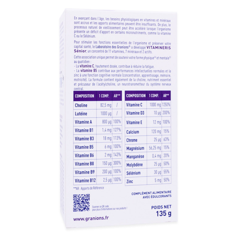 .N'attendez plus pour offrir à votre organisme le soutien qu'il mérite, commandez dès maintenant les GRANIONS VITAMINERIS SÉNIOR et profitez de leur goût délicieux au cassis !