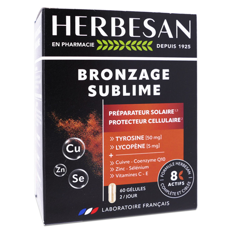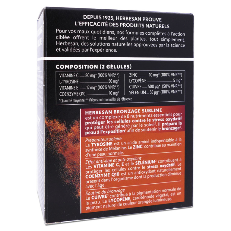 Herbesan, expert en compléments alimentaires, propose ce produit enrichi d'un complexe de 8 nutriments essentiels : la tyrosine, un acide aminé qui participe à la synthèse de la mélanine ; le zinc, qui contribue au maintien d'une peau normale ; les vitamines C et E ainsi que le sélénium, qui contribuent à la protection des cellules contre le stress oxydatif ; le coenzyme Q10, qui est un antioxydant naturellement présent dans l'organisme diminuant avec l'âge ; le cuivre, qui participe à la pigmentation normale de la peau ; et le lycopène, un caroténoïde végétal qui est un pigment naturel de couleur orangée.