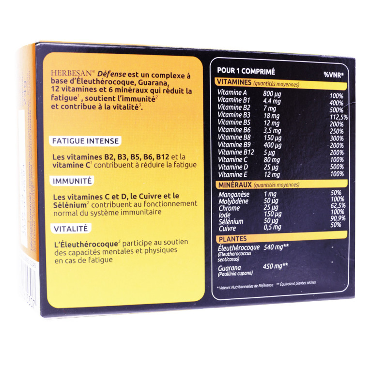 Le complément alimentaire Défense HERBESAN est spécialement formulé pour soutenir votre système immunitaire grâce à une synergie d'ingrédients actifs. Parmi les vitamines et minéraux contenus dans la formule, les vitamines B et C contribue à réduire la fatigue ; les vitamines C et D, le cuivre et le sélénium contribue au fonctionnement normal du système immunitaire. Des extraits de plantes comme l'éleuthérocoque qui participe au soutien des capacités mentales et physiques en cas de fatigue, complètent la formule. Chaque comprimé est conçu pour offrir une absorption optimale, vous permettant de bénéficier pleinement de ses propriétés.