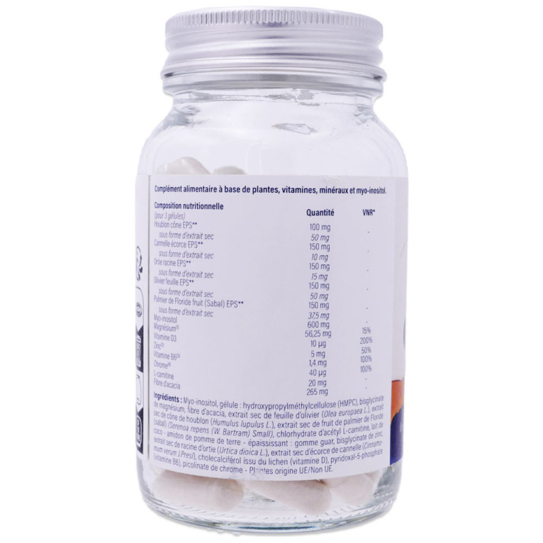 Pour 3 gelules : Houblon cône EPS*. 100 mg. sous forme d’extrait sec. 50 mg. Cannelle écorce EPS**. 150 mg. sous forme d’extrait sec. Orie racine EPS**. 10 m. 150 mg. sous forme d’extrait sec. Olivier feuille EPS**. 15 mg. 150 mg. sous forme d’extrait sec. Palmier de floride fruit (Sabal) EPS**. 150 mg sous forme d’extrait sec. 50 mg. Myo-inositol. sous forme d’extrait sec. 600 mg 37,5 mg. Magnésium. 56,25 mg. Viamine D3. 10 ùg. Vitamine B6).1,4 mg. Chrome. 40 ùg. L-canine. 20 mg. Fibre d’acaria. 265 mg