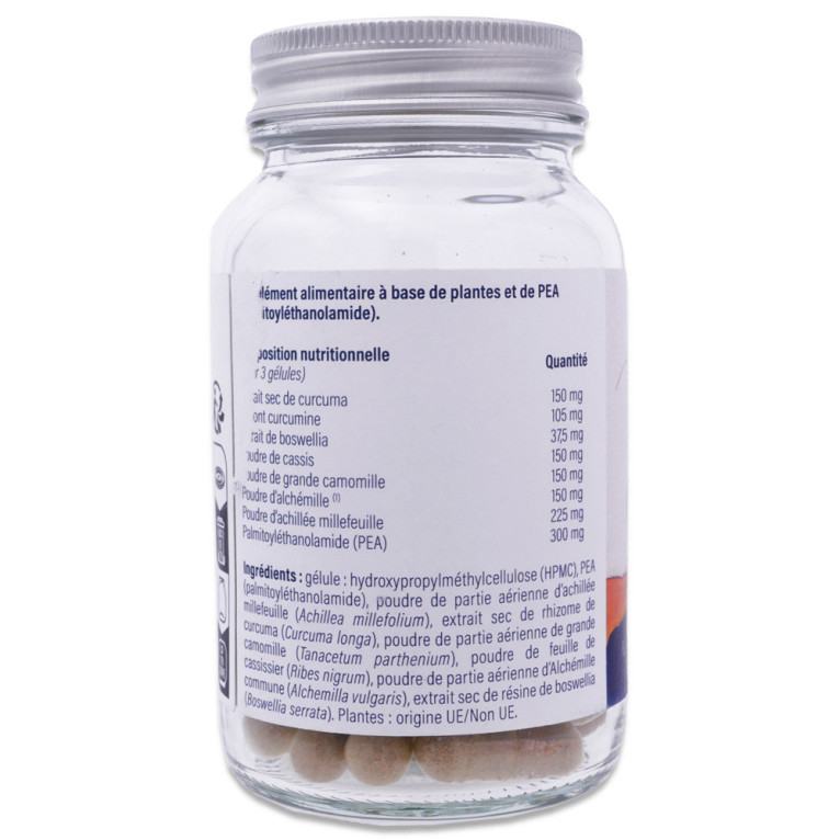 Complément alimentaire à base de plantesPEA (Palimtoyléthanolamide), gélule végétale HPMC, Poudre de parties aériennes d'Achillée millefeuille (Achillea millefolium), Extrait de rhizomes de Curcuma (Curcuma longa) standardisé en curcumine, Poudre de résine de Boswellia (Boswellia serrata), Poudre de parties aériennes de Grande camomille (Tanacetum parthenium), Poudre de feuilles de Cassissier (Ribes nigrum), Poudre de parties aériennes d'Alchémille commune (Alchemilla vulgaris). La liste des ingrédients peut être soumise à des variations, nous vous conseillons de toujours vérifier la liste figurant sur le produit acheté.