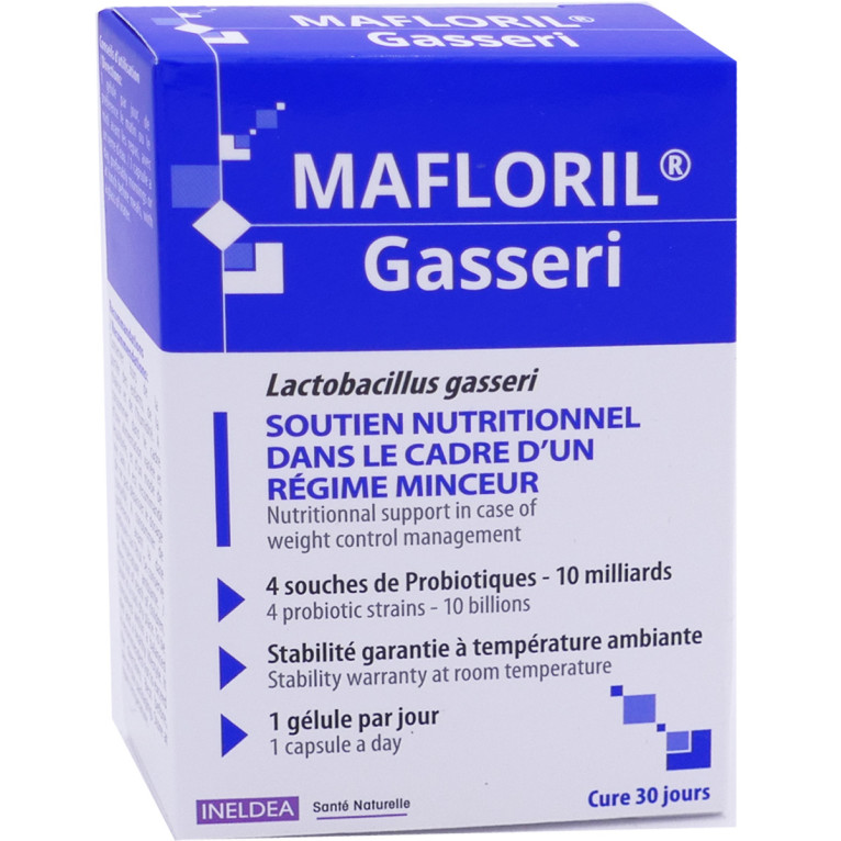MAFLORIL Gasseri Soutien nutritionnel dans le cadre d'un régime minceur des Laboratoires INELDEA à prix discount, un complément alimentaire à base de 4 souches de ferments lactiques 10 milliards dans votre parapharmacie en ligne discount.