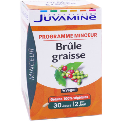 JUVAMINE BRÛLE-GRAISSE Programme Minceur est spécialement formulé à partir de Thé Vert qui soutient les dépenses énergétiques et l’oxydation des graisses tout en participant à la dégradation des lipides. La formule est complétée par du Kola qui participe au métabolisme des graisses et par du Café Vert. Ce complément alimentaire contient 60 gélules à prendre sur 30 jours.