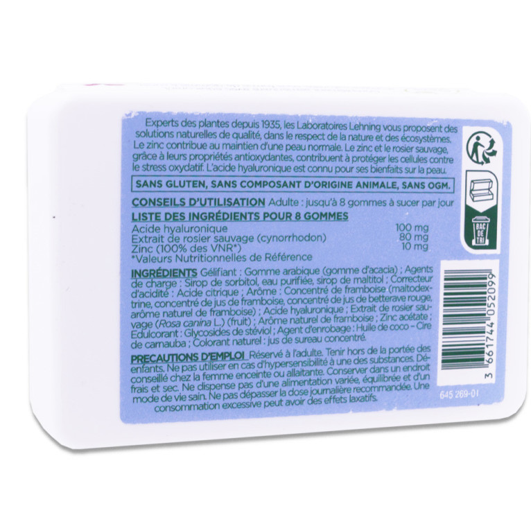 Le laboratoire Lehning, reconnu pour son expertise en compléments alimentaires, propose une formule innovante pour le soutien de la beauté de la peau. L'acide hyaluronique, présent dans la composition, contribue à l'hydratation et à l'élasticité de la peau. Le zinc et le rosier sauvage participent à la protection des cellules contre le stress oxydatif. Le zinc, quant à lui, soutient le maintien d'une peau normale. Ces gommes sont délicatement aromatisées au goût naturel de framboise, offrant une expérience gustative agréable.
