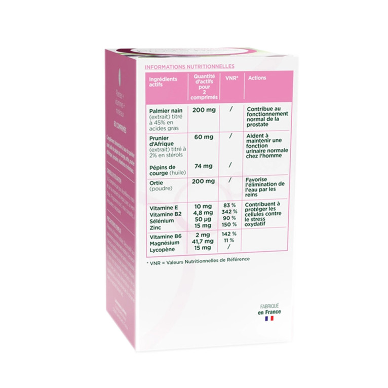 Pour 2 comprimés - VNR* : Palmier nain (extrait) titré à 45% en acides gras 200 mg ; Prunier d' Afrique (extrait) titré à 2% en stérols 60 mg ; Pépins de courge (huile) 74 mg ; Ortie (poudre) 200 mg ; Vitamine E 10 mg 83%* ; Vitamine B2 4.8 mg 342%* ; Sélénium 50 µg 90%* ; Zinc 15 mg 150%* ; Vitamine B6 2 mg 142%* ; Magnésium 41.7 mg 11%* ; Lycopène 15 mg.