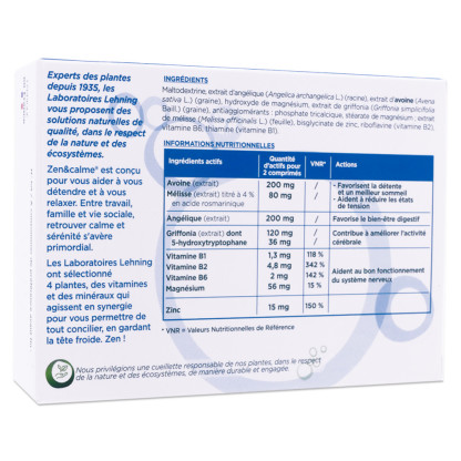Ce complément alimentaire de la marque Lehning associe les propriétés de quatre plantes soigneusement sélectionnées : l'avoine, la mélisse, l'angélique et le griffonia : l'avoine et la mélisse favorisent la détente pour un meilleur sommeil et contribuent à réduire les états de tension ; l'angélique favorise le confort digestif tandis que le griffonia contribue à améliorer l'activité cérébrale. De plus, ce produit contient trois vitamines essentielles (B1, B2, B6), du magnésium et du zinc : les vitamines B et le magnésium participent au fonctionnement normal du système nerveux. Offrez-vous un moment de calme et de sérénité avec LEHNING ZEN & CALME, un allié idéal pour votre bien-être au quotidien !