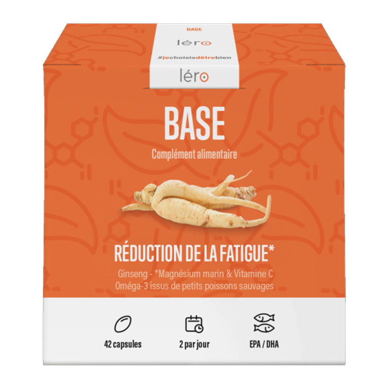 Le laboratoire LERO, expert en nutrition-santé, développe des compléments alimentaires associant des oméga 3 à des vitamines et des oligoéléments, afin d’offrir une efficacité optimale et contribuer au maintien du bien-être. LERO BASE du Laboratoire LERO est un complément alimentaire en capsules. Sa formule est composée de vitamines C, B6, B12, de magnésium, de fer, et de ginseng qui contribuent à la réduction de la fatigue, ainsi que d'Oméga-3 issus de petits poissons sauvages: EPA/ DHA. Le fer et la vitamine B12 quant à eux participent également à la formation normale des globules rouges.