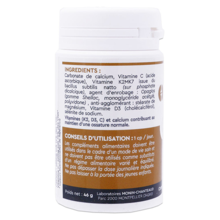 Complément Alimentaire à base de: carbonate de calcium, acide ascorbique (vitamine C), Uni K2 (gomme arabique, huile de tournesol, L ascorbyl palmitate, vitamine K2), Agent enrobage : Opadry (hydroxypropyl-methylcellulose - polydextrose-huilede noix de coco - E171), Anti-agglomérant : stéarate de magnésium, cholécalciférol (vitamineD3), sélénite de sodium.