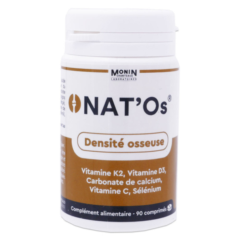 NAT’Os du laboratoire MONIN CHATEAUD, est un complément alimentaire à base de sélénium, qui participe à la protection des cellules contre le stress oxydatif, et de vitamine K2, qui contribue à maintenir une bonne ossature. Vient s’ajouter à ce complément alimentaire du calcium, nécessaire au maintien d’une ossature normale.