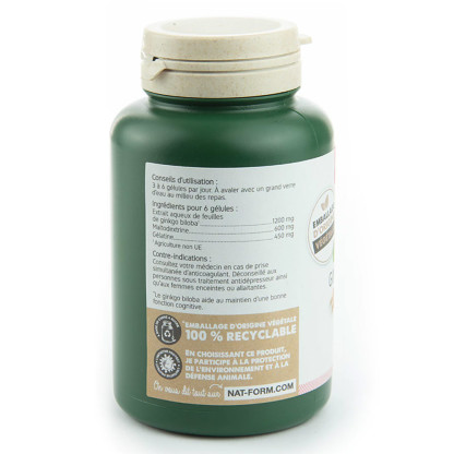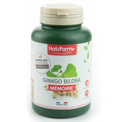 GINKGO BILOBA de Nat&Form est un complément alimentaire en gélules fabriqué en France formulé à partir d'extrait aqueux de feuilles de Ginkgo Biloba qui contribue à maintenir une bonne fonction cognitive.
