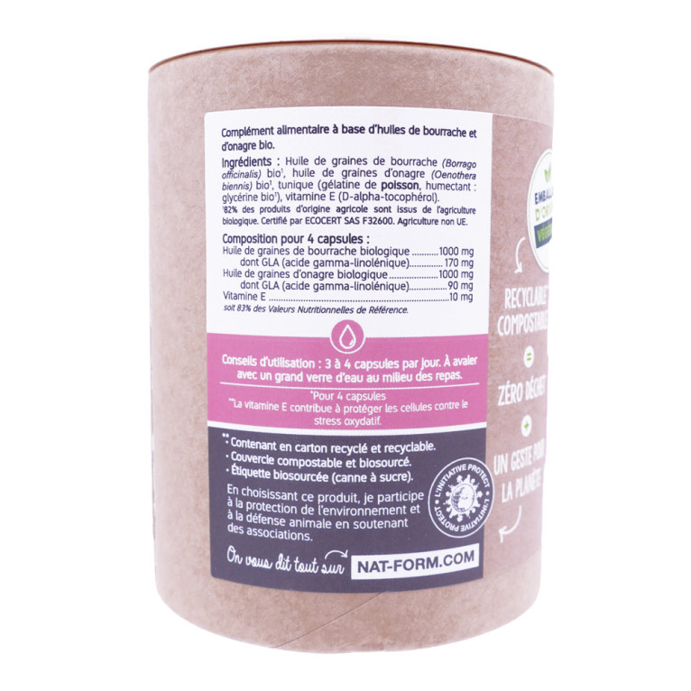Ingrédients : Huile de graines de bourrache biologique*, huile de graines d'onagre biologique*, tunique (gélatine de poisson, humectant : glycérine biologique*), vitamine E (D-alpha-tocophérol).*82% des ingrédients d'origine agricole sont issus de l'agriculture biologique. Certifié par ECOCERT SAS F32600 (FR-BIO-01). Agriculture non UE.
