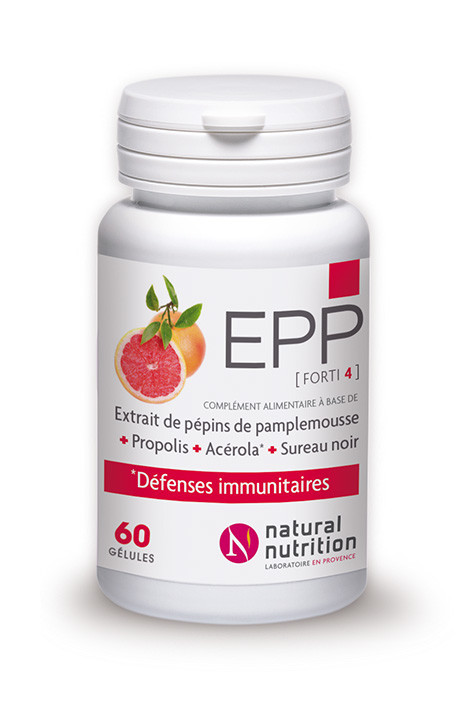 EPP FORTI 4 discount de NATURAL NUTRITION, la santé au naturel dans votre parapharmacie en ligne à prix discount, dans un complément alimentaire à base d'extrait de pépins de pamplemousse, propolis, acérola et sureau noir qui à eux deux aident à soutenir les défenses naturelles.