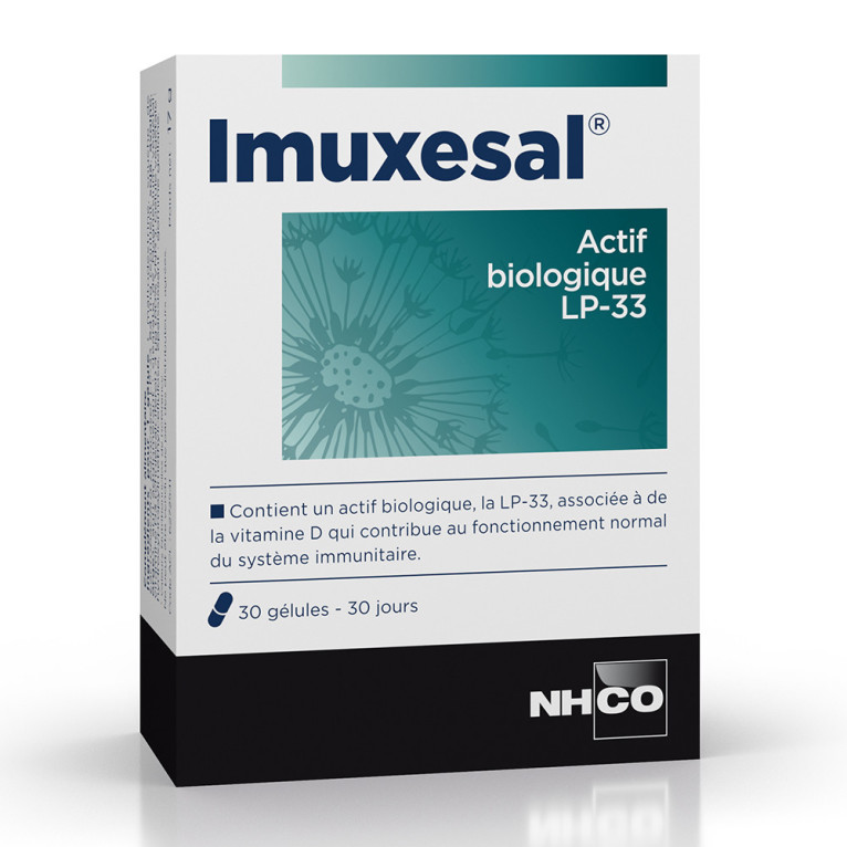 Imuxesal du Laboratoire NHCO, un complément alimentaire à base de Lactobacillus paracasei LP-33 et de vitamine D qui contribue au fonctionnement normal du système immunitaire, dans votre parapharmacie en ligne.
