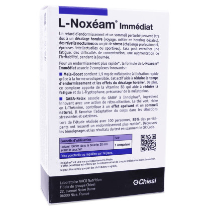 Ce complément alimentaire du laboratoire NHCO est formulé pour répondre aux besoins des personnes souhaitant un soutien temporaire pour un endormissement rapide. Pour faciliter un endormissement rapide, la formule de L-Noxéam Immédiat combine deux complexes novateurs :