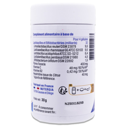 Le laboratoire Nutergia, reconnu pour son expertise en micronutrition, propose une synergie unique de 5 souches de bactéries vivantes dosées à 8 milliards par gélule, contribuant au maintien d'un microbiote intestinal équilibré. La vitamine C contenue dans la formule contribue à la protection des cellules contre le stress oxydatif tandis que la vitamine B2 participe au maintien des muqueuses normales. Cette formule innovante offre un soutien optimal pour le confort digestif et le fonctionnement normal du système immunitaire. Découvrez dès maintenant les avantages de NUTERGIA ERGYPHILUS GST et faites le choix d'une complémentation de qualité pour votre quotidien.