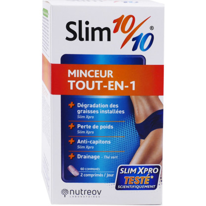 SLIM 10/10 Minceur Tout en 1 est un complément alimentaire conditionné sous forme de comprimés spécialement formulé à base du complexe Slim Xpro composé de Sinetrol Xpur qui est un complexe breveté NUTREOV. Le complexe Sinetrol Xpur contient des extraits secs d’agrumes et du guarana. Le guarana contribue au contrôle du poids et au métabolisme des graisses. SLIM 10/10 Minceur Tout en 1 contient un extrait de thé vert qui est traditionnellement utilisé pour favoriser l'élimination rénale de l'eau. Sa formule est complétée par de la caféine, des extraits de plantes, vitamine et minéral (orthosiphon, vitamine C extrait de pousses de bambou, manganèse).