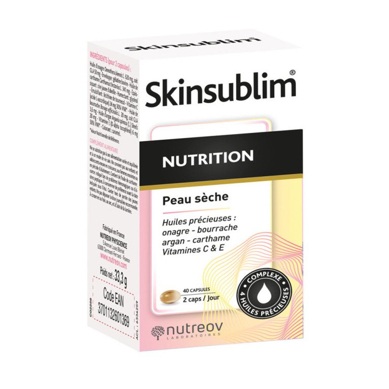 Formulé à base de vitamines, et huiles précieuses (carthame, onagre, bourrache, argan), ce complément alimentaire contribue à la protection et au confort de la peau sèche. L’huile de carthame extraite par pression à froid contribue à lutter contre dessèchement de la peau. La vitamine C contribue à la formation normale de collagène pour le bon fonctionnement de la peau, tandis que la vitamine E contribue à la protection des cellules contre le stress oxydatif. Les capsules sont faciles à avaler et à digérer. Prenez soin de votre peau avec SkinSublim de Nutreov et retrouvez une peau saine et éclatante.