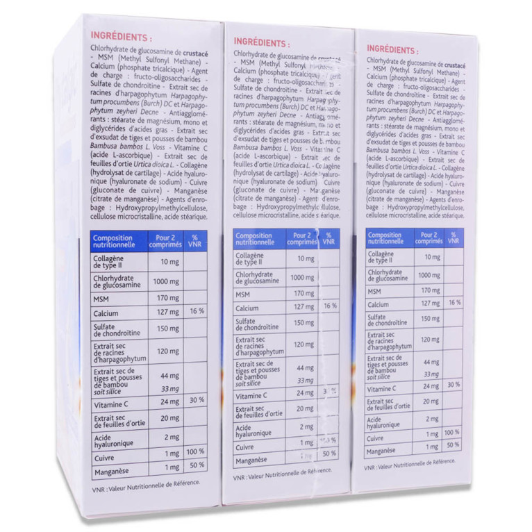 Chlorhydrate de glucosamine de crustacé – MSM (Methyl Sulfonyl Methane) – Calcium (phosphate tricalcique) – Agent de charge : fructo-oligosaccharides – Sulfate de chondroïtine – Extrait sec de racines d’harpagophytum Harpagophytum procumbens (Burch) DC et Harpagophytum zeyheri Decne – Antiagglomérants : stéarate de magnésium, mono et diglycérides d’acides gras – Extrait sec d’exsudat de tiges et pousses de bambou Bambusa bambos L. Voss – Vitamine C (acide L-ascorbique) – Extrait sec de feuilles d’ortie Urtica dioica L. – Collagène (hydrolysat de cartilage) – Acide hyaluronique (hyaluronate de sodium) – Cuivre (gluconate de cuivre) – Manganèse (citrate de manganèse) – Agents d’enrobage : Hydroxypropylmethylcellulose, cellulose microcristalline, acide stéariqueg
