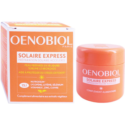 OENOBIOL Solaire Express Préparation solaire accélérée est conditionné sous forme de capsules à prendre avant, pendant et après l'exposition solaire. Sa composition associe des pigments naturels (lycopène, lutéine), de la vitamine E d'origine végétale, du sélénium et du zinc pour contribuer à protéger les cellules du stress oxydatif et du cuivre qui contribue à la pigmentation normale de la peau