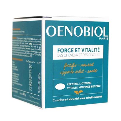 OENOBIOL FORCE ET VITALITÉ 60 comprimés est spécialement formulé sous forme de comprimés à base de Kératine: une protéine principale constitutive des cheveux et des ongles, synthétisée à partir d’acides aminés soufrés dont la cystéine et la cystine.La formule est complétée par un minéral: le zinc qui contribue à la synthèse normale des protéines dont la kératine et permet, au quotidien, le maintien des cheveux et des ongles normaux. Dans OENOBIOL FORCE ET VITALITÉ 60 comprimés, le zinc apporte 130% des valeurs nutritionnelles de référence pour la prise journalière de 2 comprimés.Ce complément alimentaire contient également de l’extrait de Myrtille qui favorise la microcirculation du cuir chevelu.