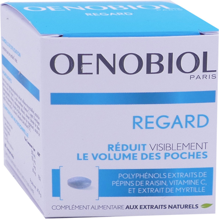 OENOBIOL REGARD est spécialement formulé sous forme de comprimés à base de pépins de raisin issus du raisin des terres de Champagne-Ardenne permettant de protéger les cellules contre le stress oxydatif généré par les radicaux libres.La formule est complétée par un extrait de Myrtille, une baie de couleur bleu-foncé contenant naturellement des anthocyanes. OENOBIOL REGARD apporte également 75% des valeurs nutritionnelles en vitamine C pour la prise journalière de 2 comprimés. La vitamine C contribue à la formation normale de collagène pour assurer le fonctionnement normal des vaisseaux sanguins.