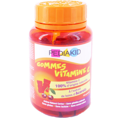 PEDIAKID® Gommes Vitamine C à base d'extrait de baies d’Acérola titré en Vitamine C permet de couvrir 100% des apports de référence en vitamine C qui contribue à la réduction de la fatigue et au soutien du métabolisme énergétique et des défenses naturelles normales de l'organisme. Sans gélatine, sans gluten, sans lactose, sans conservateur et sans arômes ni colorants artificiels, elles offrent une formule pratique, ludique et idéale pour les enfants. Au goût de cerise, elles sont en forme de petits oursons pour le plaisir des plus petits.