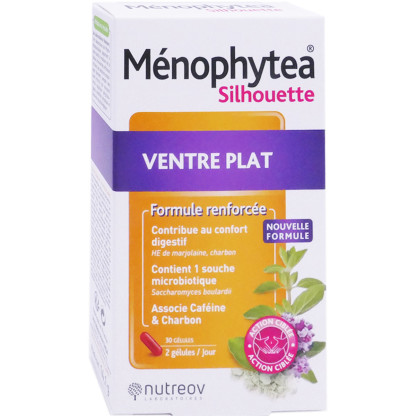 MÉNOPHYTEA SILHOUETTE VENTRE PLAT des laboratoires NUTREOV, un complément alimentaire en gélules associant une souche microbiotique, des vitamines et des minéraux et des actifs d’origine végétale dont l'huile essentielle de marjolaine et le charbon qui contribuent au confort digestif.