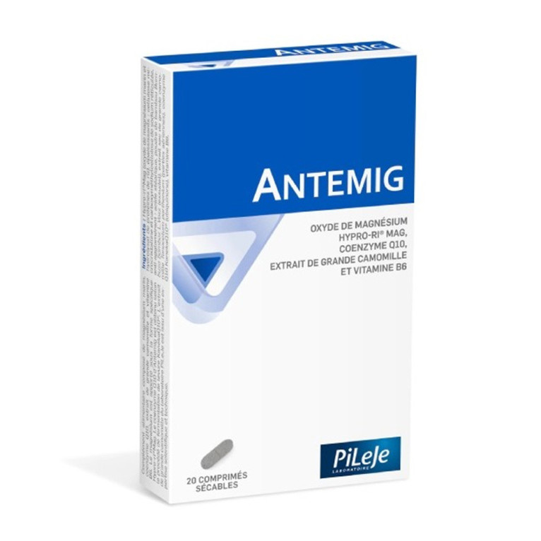 Le complément alimentaire Pileje Antemig contient de l'oxyde de magnésium marin Hypro-ri®mag, de la coenzyme Q10, de la vitamine B6 et de l'extrait de grande camomille. Le magnésium est présent sous la forme spécifique Hypro-ri®mag, tandis que la coenzyme Q10 est obtenue par fermentation de levure KanekaQ10. L'extrait de grande camomille utilisé dans la formule est issu d'une expertise scientifique et technique du laboratoire PiLeJe. Ce complément alimentaire est facile à prendre grâce à ses comprimés sécables. Il convient aux adultes.