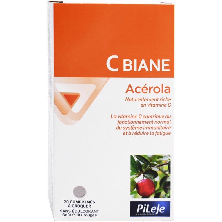 C BIANE Acérola de PILEJE est spécialement formulé à base d’Acérola. L’acérola est un fruit comestible ressemblant à une cerise, issu d'un arbuste sauvage, l’acérola, cultivé dans les régions tropicales et subtropicales telles que l’Amérique du nord, l’Amérique centrale ou l’Amérique du sud. L’Acérola est un aliment intéressant sur le plan nutritionnel grâce à sa teneur en vitamine C. La vitamine C qu’elle contient contribue au fonctionnement normal du système immunitaire ainsi qu’à réduire la fatigue et à protéger les cellules contre le stress oxydatif.