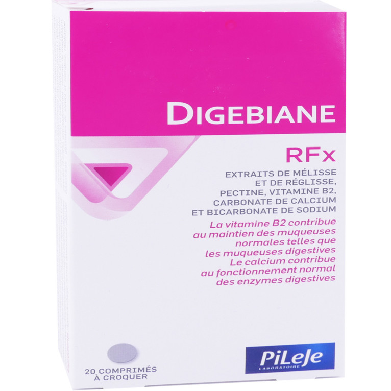 DIGEBIANE RFx est spécialement formulé sous forme de comprimés à croquer à base de Calcium qui contribue au fonctionnement normal des enzymes digestives. La formule est complétée par de la vitamine B2 qui contribue au maintien des muqueuses normales telles que les muqueuses digestives. La vitamine B2 ainsi que le Calcium contenus dans DIGEBIANE RFx apportent, chacune, 15% des valeurs nutritionnelles de référence pour la prise journalière de 4 comprimés.