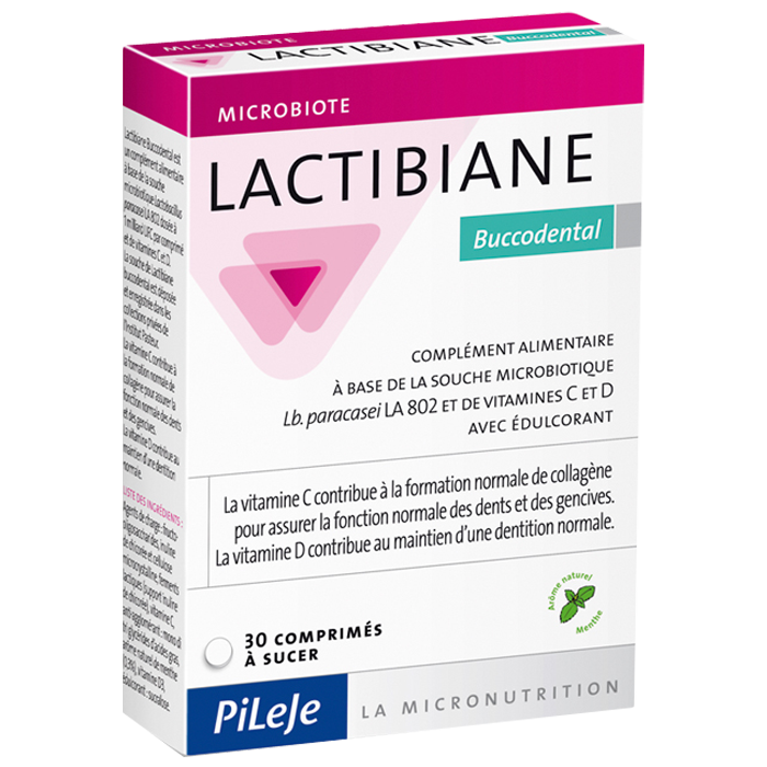 LACTIBIANE Buccodental du laboratoire PILEJE à prix discount, en vente dans votre parapharmacie en ligne discount, un complément alimentaire conçu à partir d’une souche microbiotique Lactobacillus paracasei LA 802 dosée à 1 milliard par comprimé.