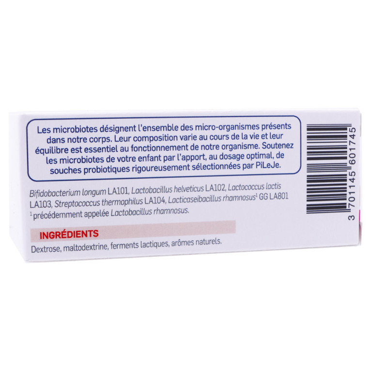 Le laboratoire Pileje, reconnu pour son expertise en micronutrition, propose une formule innovante destinée aux enfants. Chaque stick contient 12 milliards de probiotiques, incluant des souches soigneusement sélectionnées telles que Bifidobacterium long LA101, Lactobacillus helveticus LA102, Lactococcus lactis LA103, Streptococcus thermophilus LA104 et Lacticaseibacillus rhamnosus GG LA801. Ces souches participent au bon équilibre de la flore intestinale et soutiennent le fonctionnement normal du système digestif. Présentés sous forme de sticks orodispersibles au goût agréable de fruits rouges, ils sont faciles à consommer et adaptés aux besoins spécifiques des enfants.