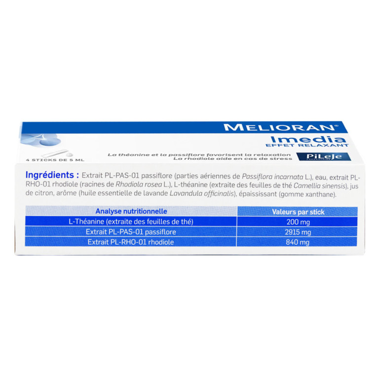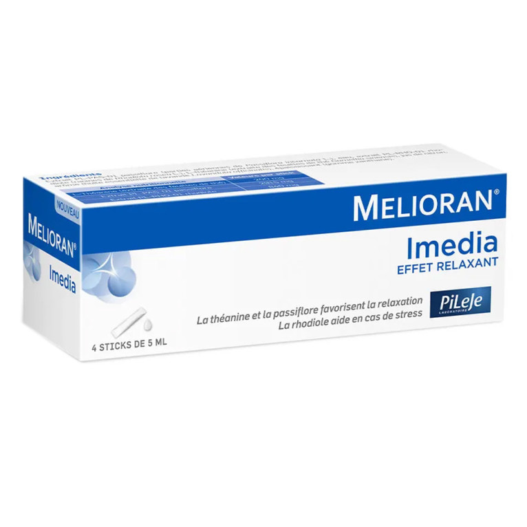 PILEJE MELIORAN IMEDIA STICKS 4X5ML : en vente en ligne, sur le site de votre parapharmacie à prix discount, ce complément alimentaire est la solution idéale pour dépasser le stress ponctuel ou d'anticipation (peur de l'avion, rendez-vous, examen,...).
