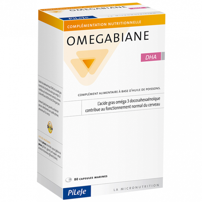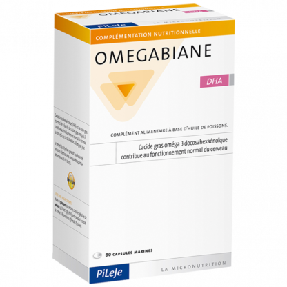 OMEGABIANE DHA des laboratoires PILEJE à prix discount dans votre parapharmacie en ligne, un complément nutritionnel à base d'acide gras Oméga 3 DHA qui contribue au fonctionnement normal cérébral. 80 capsules