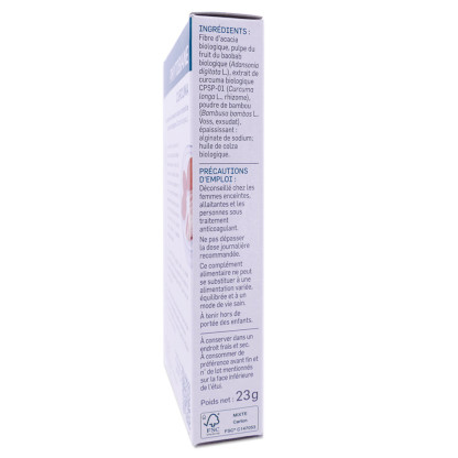 Fibre d'acacia biologique, pulpe du fruit du baobab biologique (Adansonia digitata L.), extrait de curcuma biologique CPSP-01 (Curcuma longa L., rhizome), poudre de bambou (Bambusa bambos L. Voss, exsudat), épaississant : alginate de sodium; huile de colza biologique..